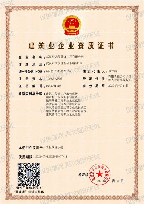 武漢好來屋裝飾工程有限公司成立于2002年3月,是一家以室內(nèi)外裝飾、建筑涂裝、建筑幕墻為一體的專業(yè)裝飾(管理)公司,公司現(xiàn)已取得湖北省建設廳建筑裝修裝飾工程專業(yè)承包壹級、建筑幕墻工程專業(yè)承包壹級、建筑工程總承包貳級、鋼結(jié)構(gòu)工程專業(yè)承包貳級、地基基礎工程專業(yè)承包貳級、消防設施工程專業(yè)承包貳級、防水防腐保溫專業(yè)承包貳級資質(zhì)。