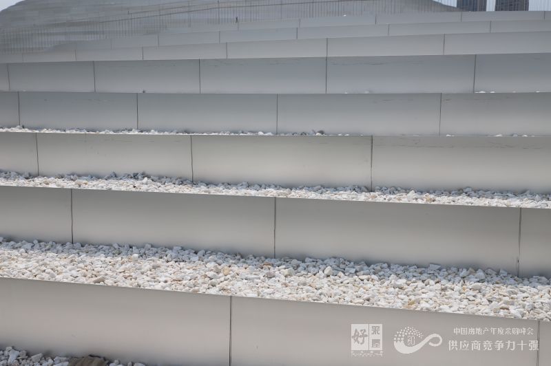 起伏的屋面以略顯抽象的等高線階梯狀造型完成,階梯的側(cè)面是銀色的金屬表面,頂面則為白色的石子和低矮的綠植。這樣人們從地面遠(yuǎn)觀建筑,會(huì)是一個(gè)有著金屬光澤的帶有些未來感的體量,假如坡面布滿綠化,那么它看上去就與自然山包無異,盡管這是以地景的形態(tài)策略而設(shè)計(jì)的,但還是希望存在一種建筑感,所以梯田狀的屋面上也沒有滿布綠植,更多的是白色的石子。