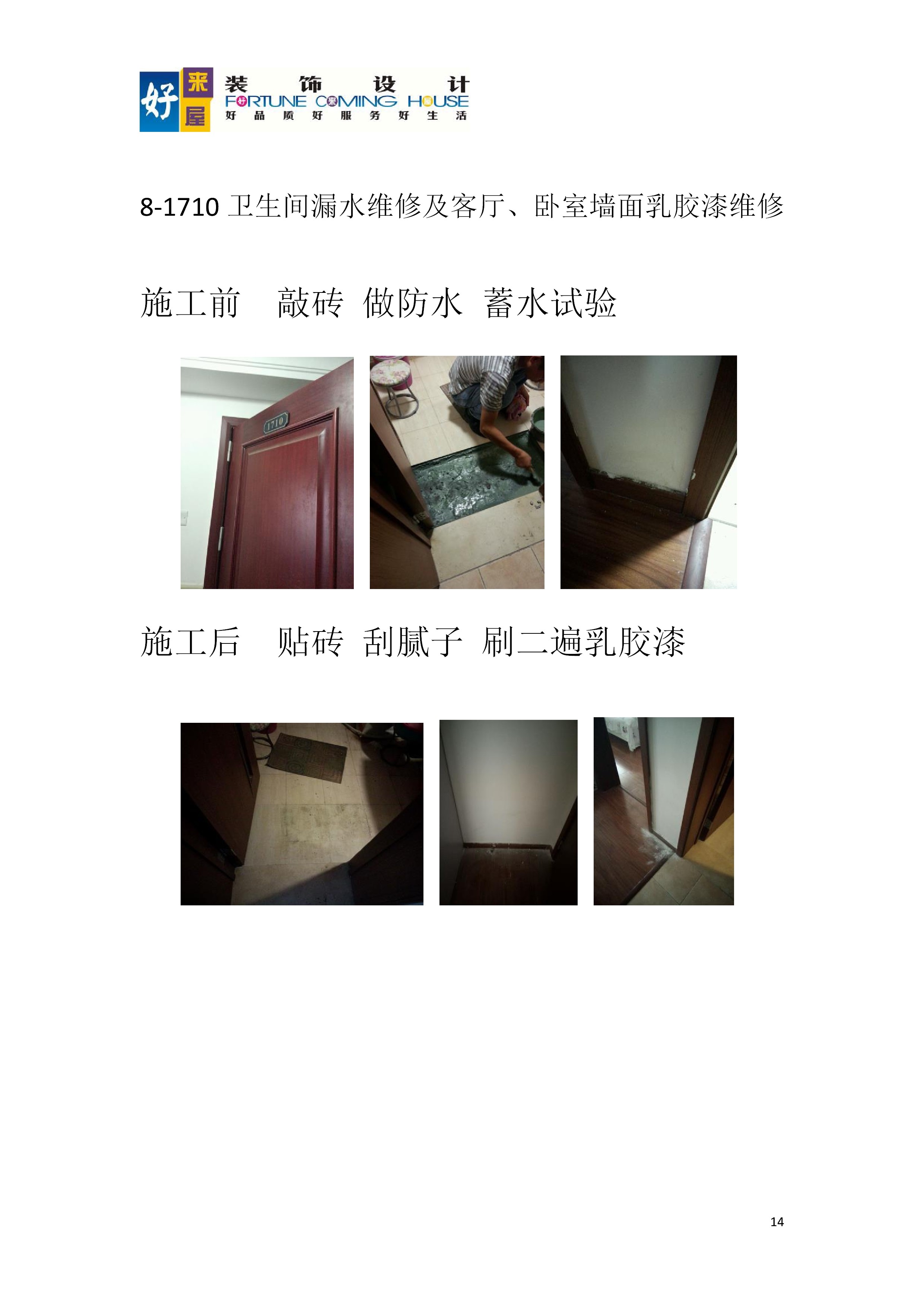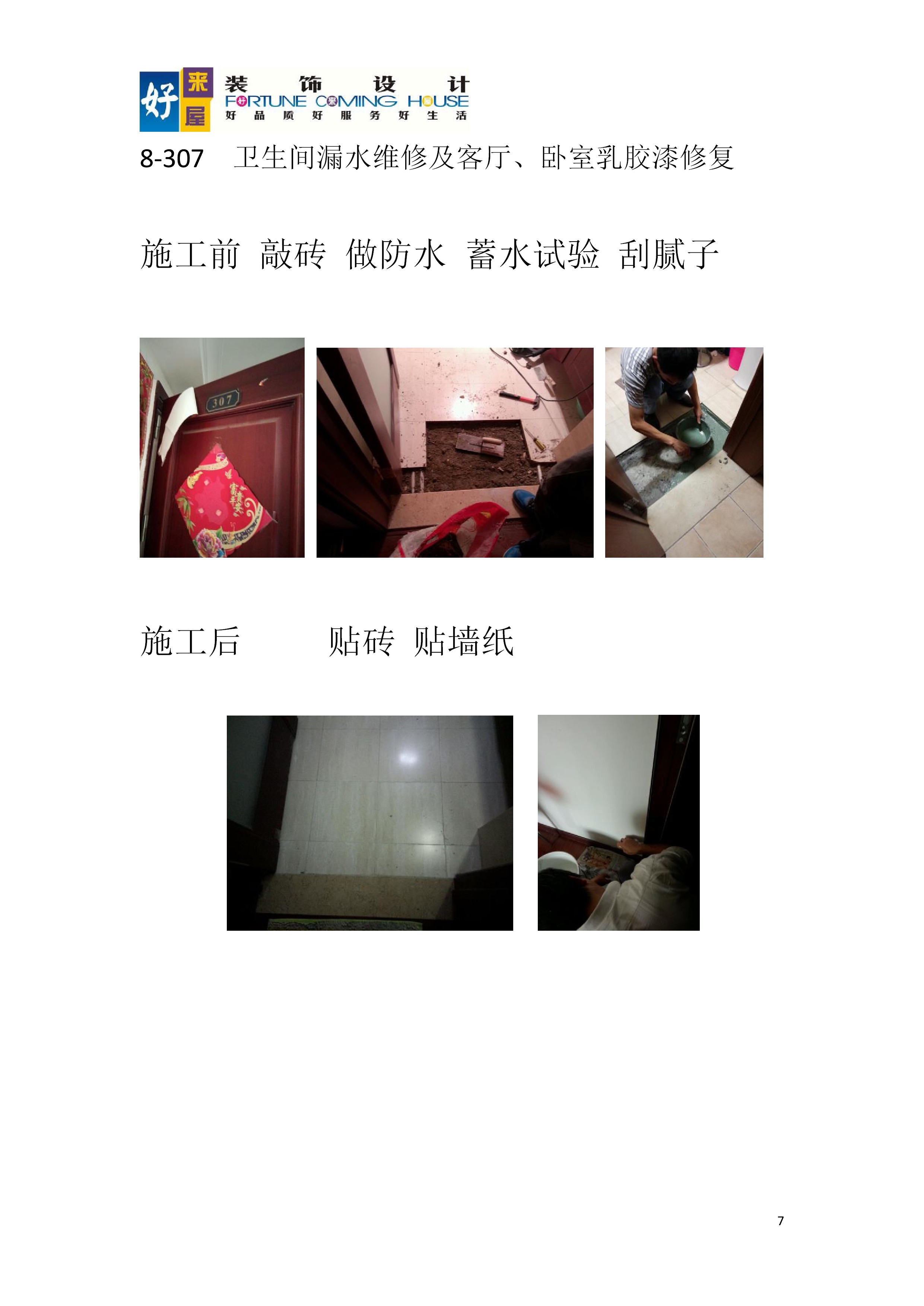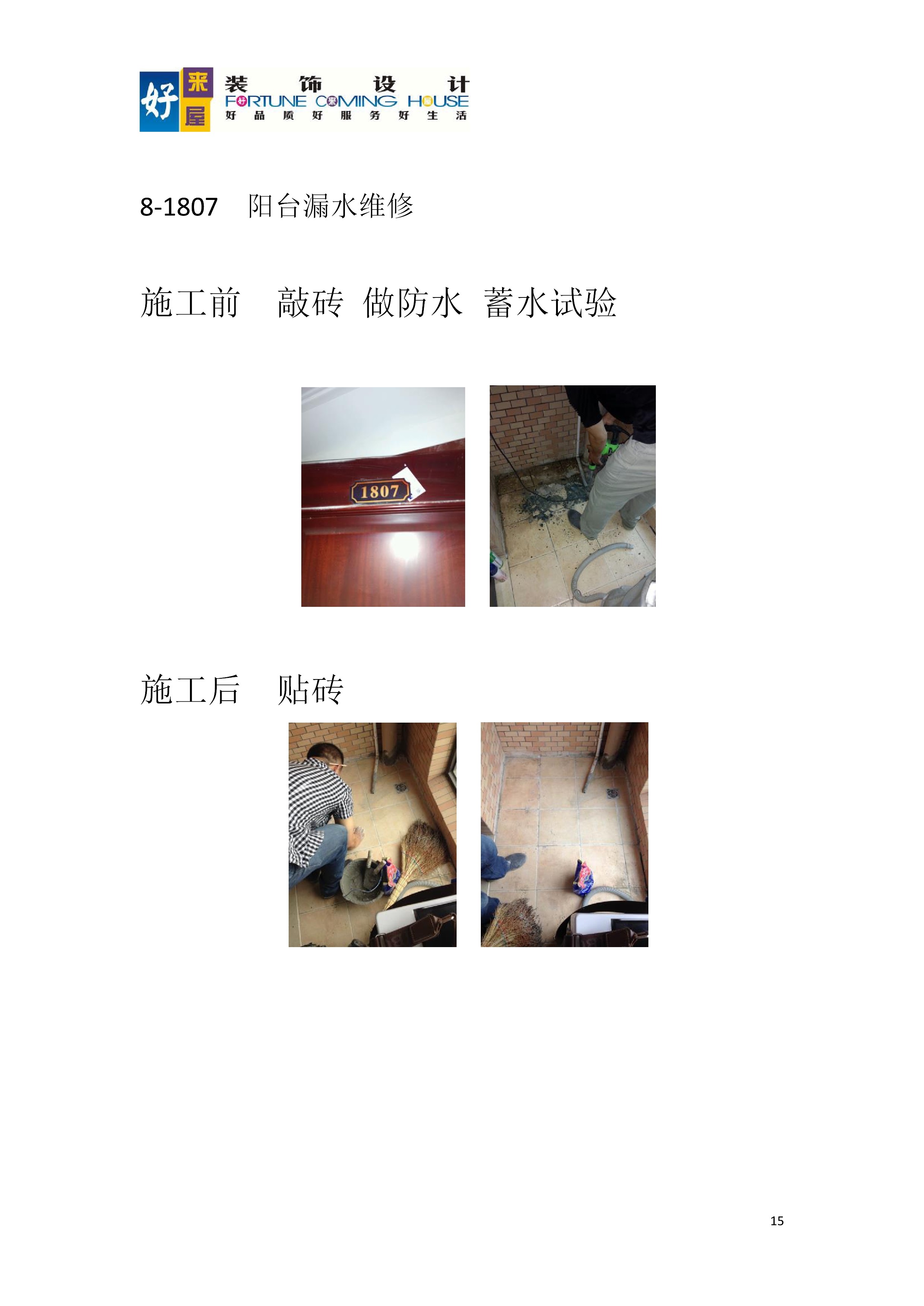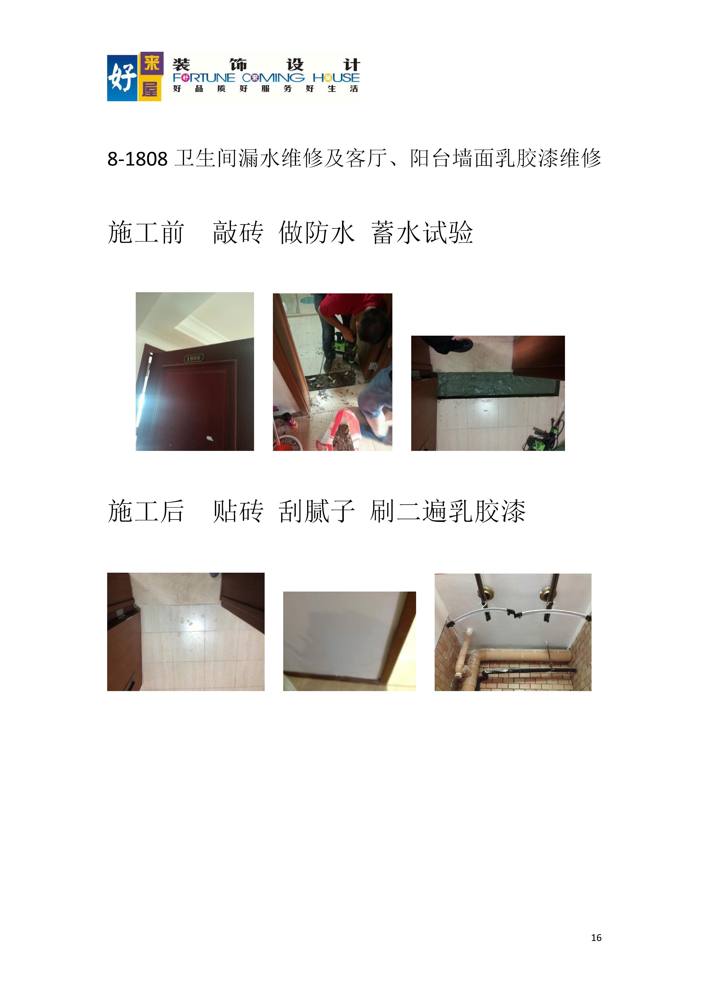 對于反映漏水情況的客戶,我們首先進(jìn)行現(xiàn)場查看,找出維修漏水的原因,衛(wèi)生間漏水主要是因為門檻石和衛(wèi)生間磚相連接之間的防水沒做好導(dǎo)致衛(wèi)生間使用時滲水,造成客廳、臥室墻面乳膠漆或者墻紙發(fā)霉,我們的解決方法是將衛(wèi)生間門檻石和衛(wèi)生間之間的磚敲掉,重新做防水,鏟除發(fā)霉的乳膠漆或墻紙,重新刮膩子,然后做蓄水試驗,確認(rèn)墻面情況良好,無發(fā)霉的情況后,將衛(wèi)生間的磚恢復(fù)起來。關(guān)于陽臺漏水的情況也是一樣的,我們首先找到陽臺漏水的原因,是因為陽臺的下水管道與磚之間的防水沒做好,我們同樣采用敲磚、做防水、蓄水試驗、恢復(fù)磚的方法進(jìn)行修復(fù)。