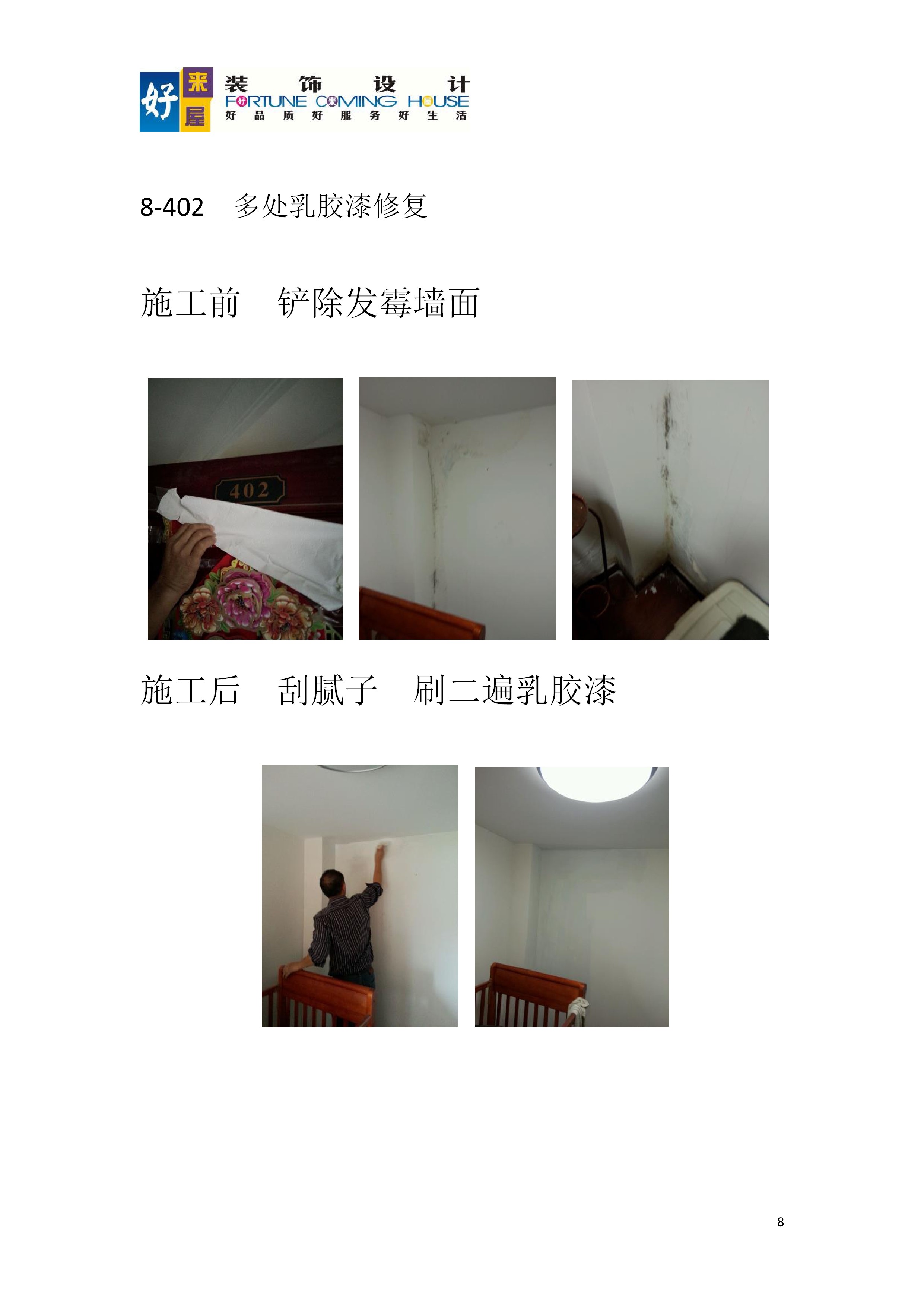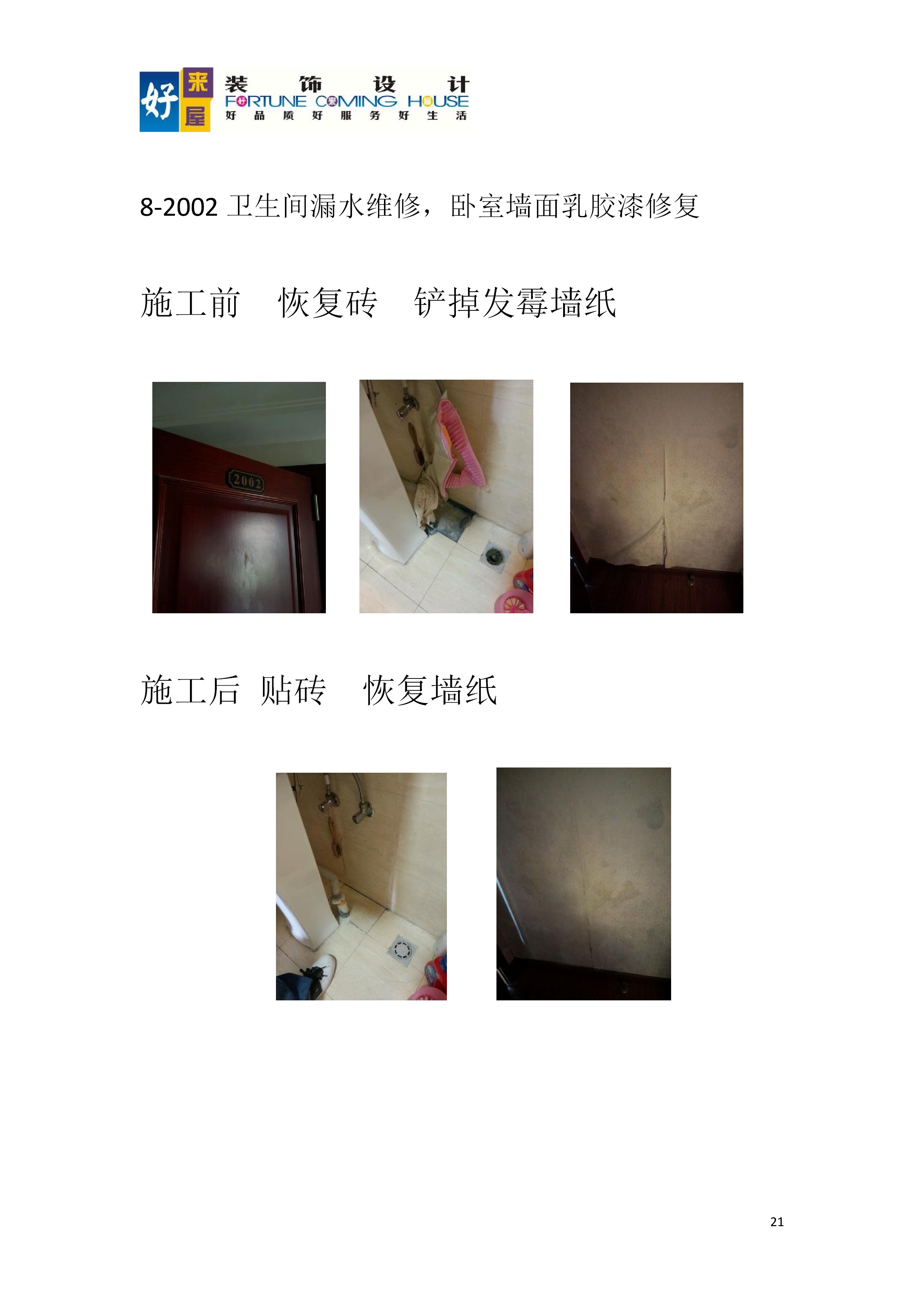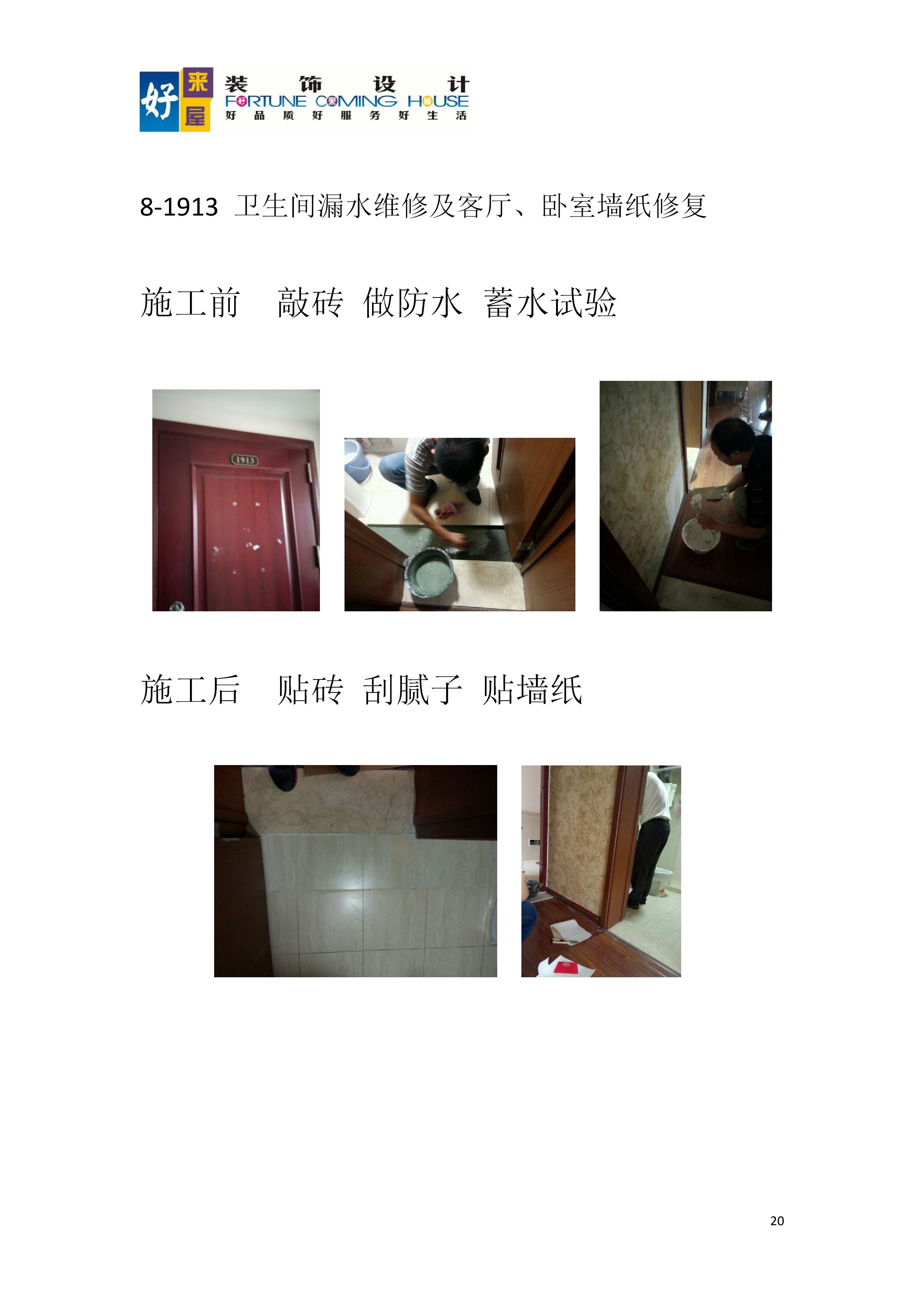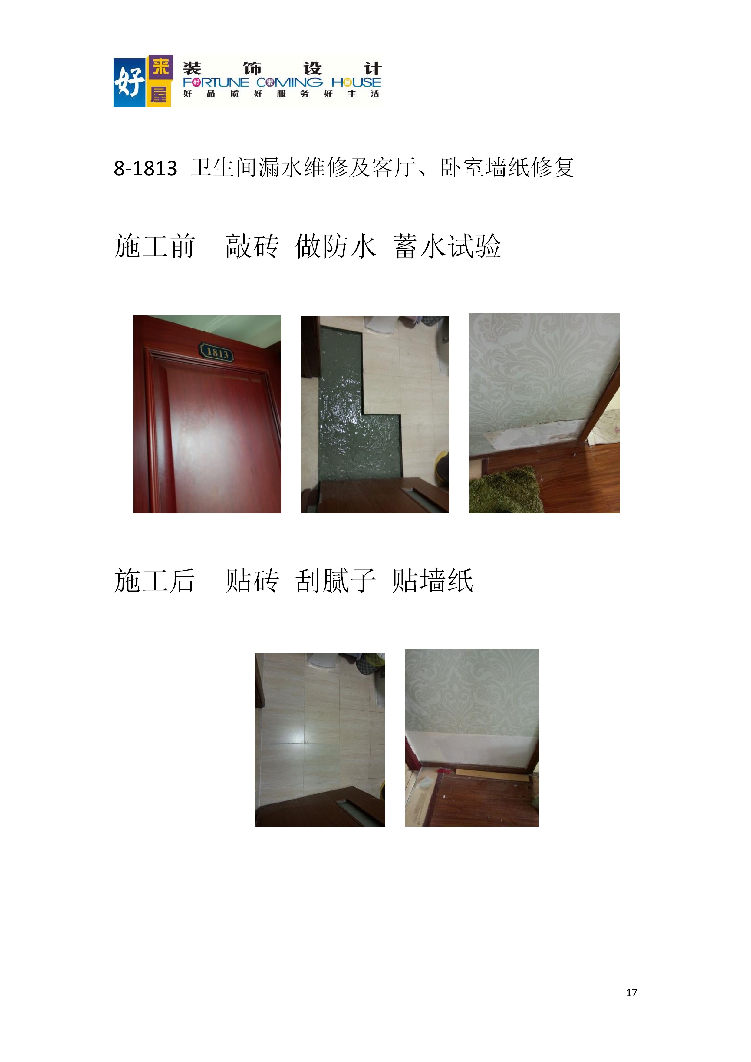 對于反映漏水情況的客戶,我們首先進(jìn)行現(xiàn)場查看,找出維修漏水的原因,衛(wèi)生間漏水主要是因為門檻石和衛(wèi)生間磚相連接之間的防水沒做好導(dǎo)致衛(wèi)生間使用時滲水,造成客廳、臥室墻面乳膠漆或者墻紙發(fā)霉,我們的解決方法是將衛(wèi)生間門檻石和衛(wèi)生間之間的磚敲掉,重新做防水,鏟除發(fā)霉的乳膠漆或墻紙,重新刮膩子,然后做蓄水試驗,確認(rèn)墻面情況良好,無發(fā)霉的情況后,將衛(wèi)生間的磚恢復(fù)起來。關(guān)于陽臺漏水的情況也是一樣的,我們首先找到陽臺漏水的原因,是因為陽臺的下水管道與磚之間的防水沒做好,我們同樣采用敲磚、做防水、蓄水試驗、恢復(fù)磚的方法進(jìn)行修復(fù)。