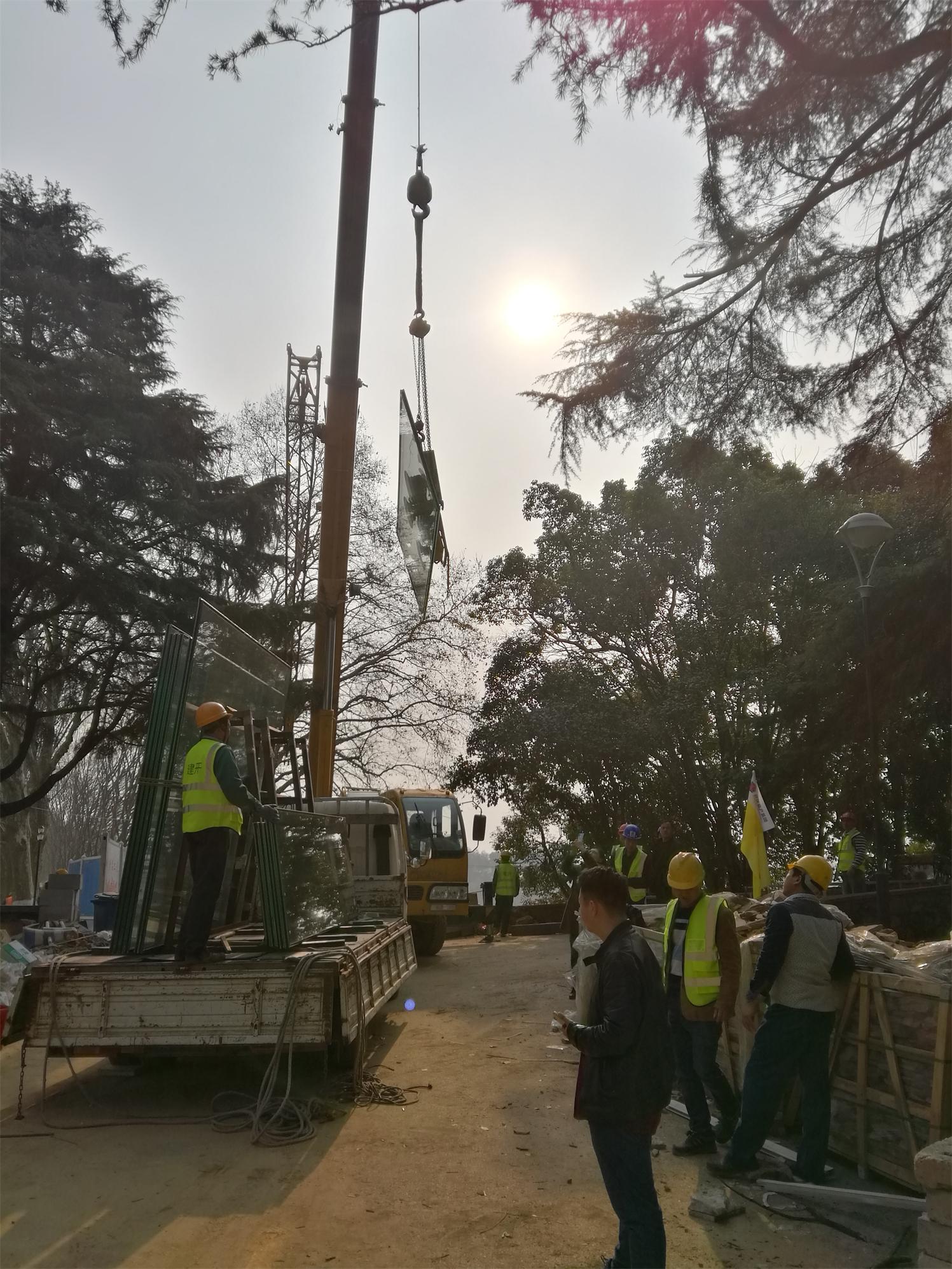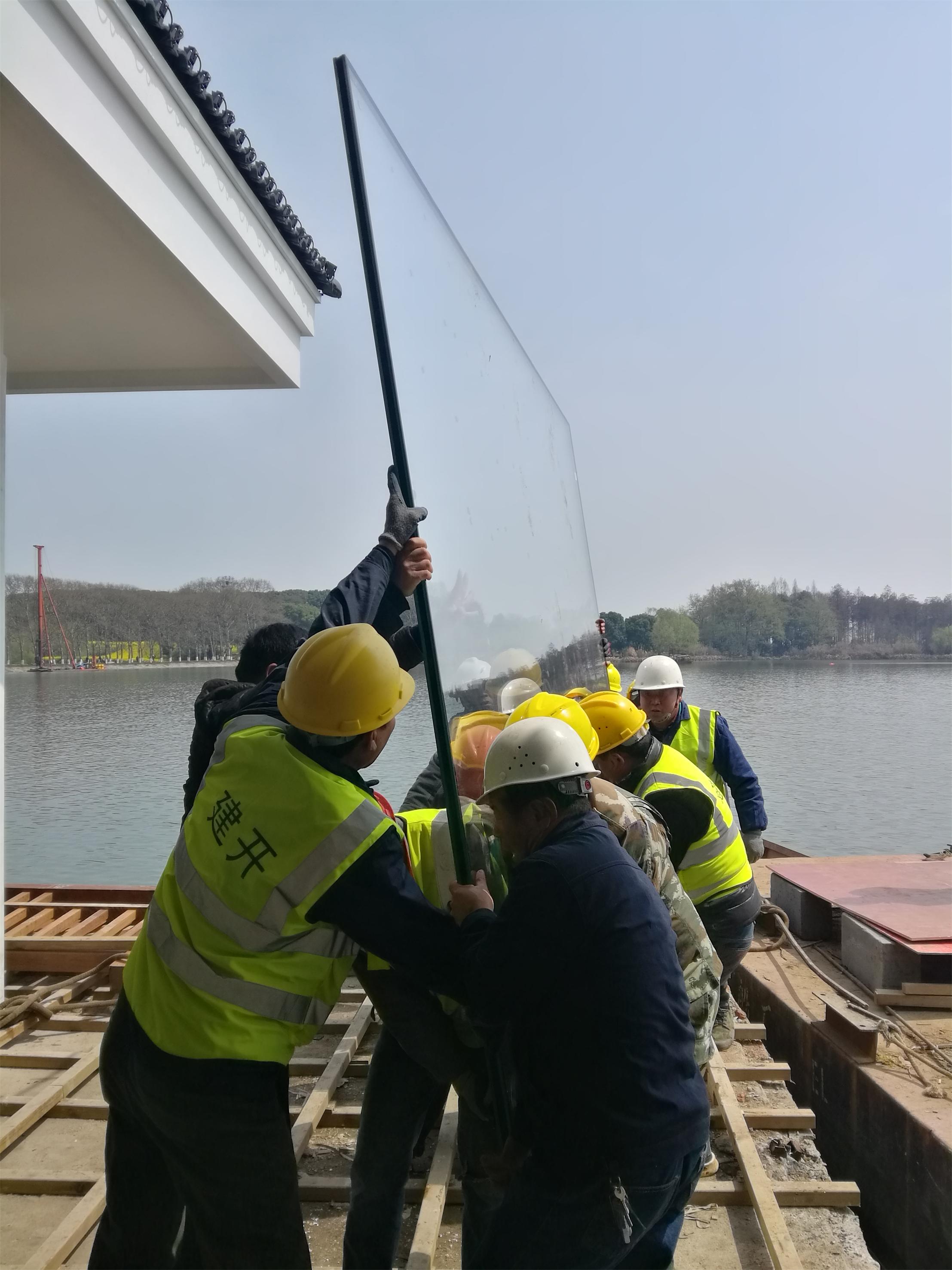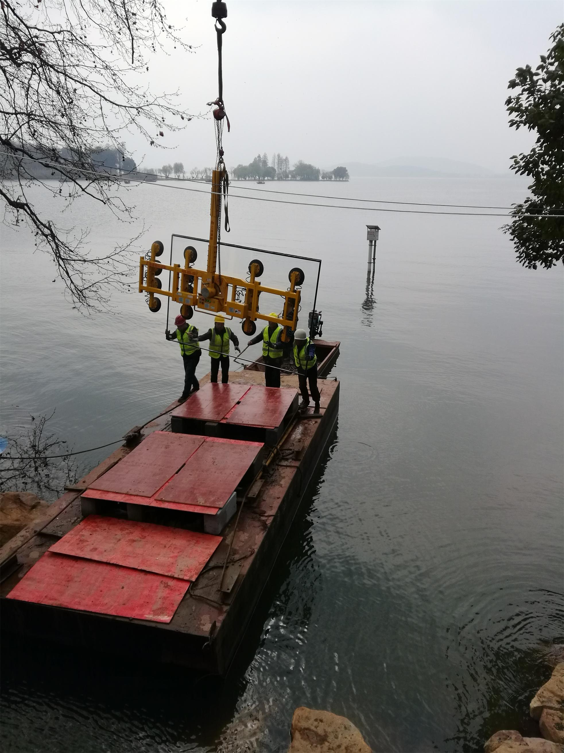 運(yùn)輸過(guò)程:玻璃運(yùn)輸至梅玲禮堂廣場(chǎng)-----采用50T吊車起吊,1.6T電動(dòng)吸盤配合吊運(yùn)玻璃--- 起吊到水上浮箱----利用動(dòng)力船在水上運(yùn)輸玻璃--運(yùn)至水榭平臺(tái)指定位置---通過(guò)人力搬運(yùn)至水榭安裝位置。