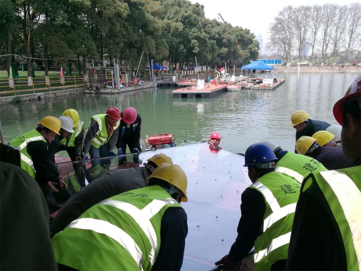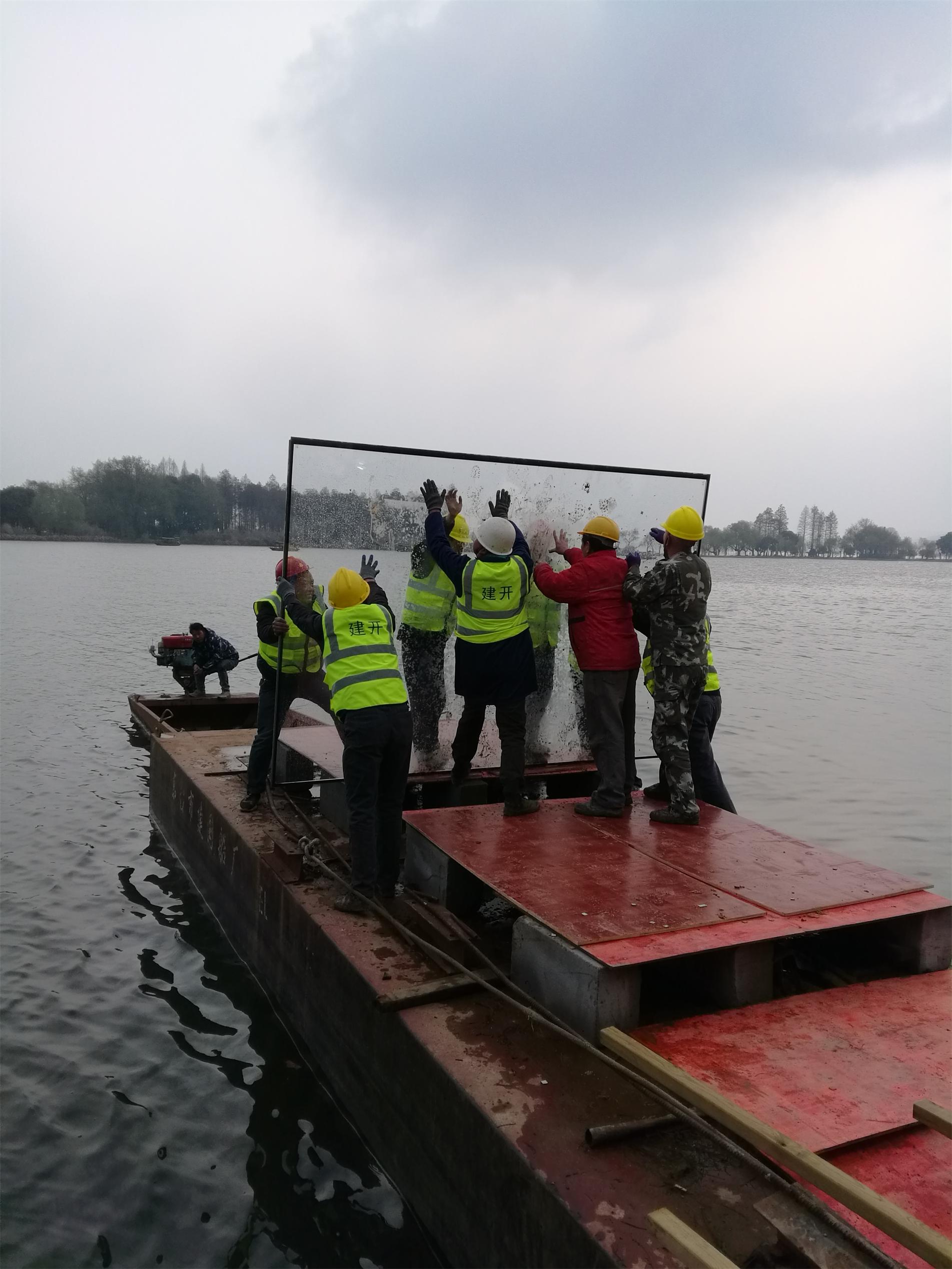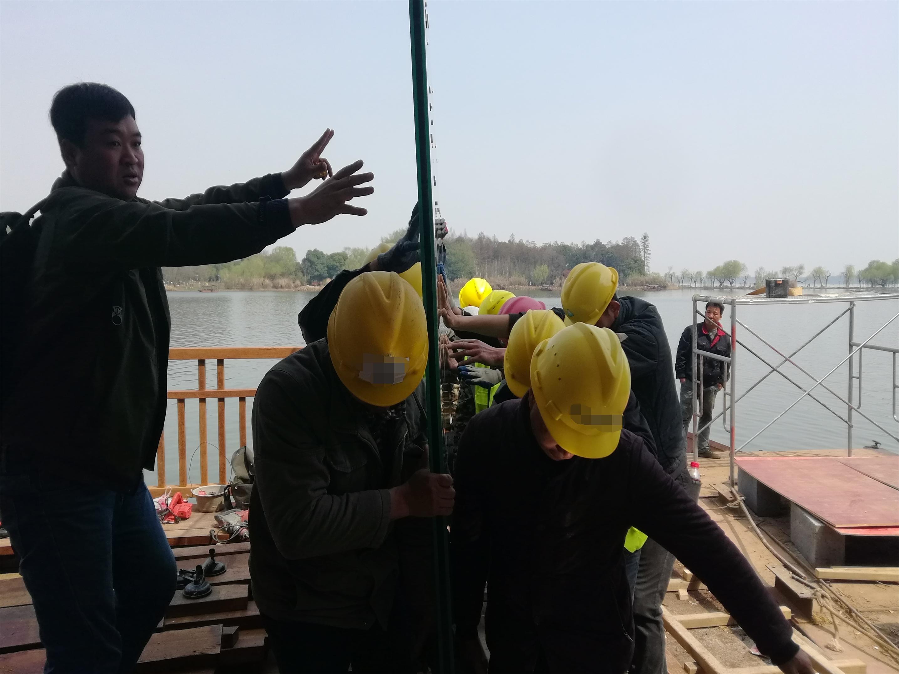 運(yùn)輸過(guò)程:玻璃運(yùn)輸至梅玲禮堂廣場(chǎng)-----采用50T吊車起吊,1.6T電動(dòng)吸盤配合吊運(yùn)玻璃--- 起吊到水上浮箱----利用動(dòng)力船在水上運(yùn)輸玻璃--運(yùn)至水榭平臺(tái)指定位置---通過(guò)人力搬運(yùn)至水榭安裝位置。